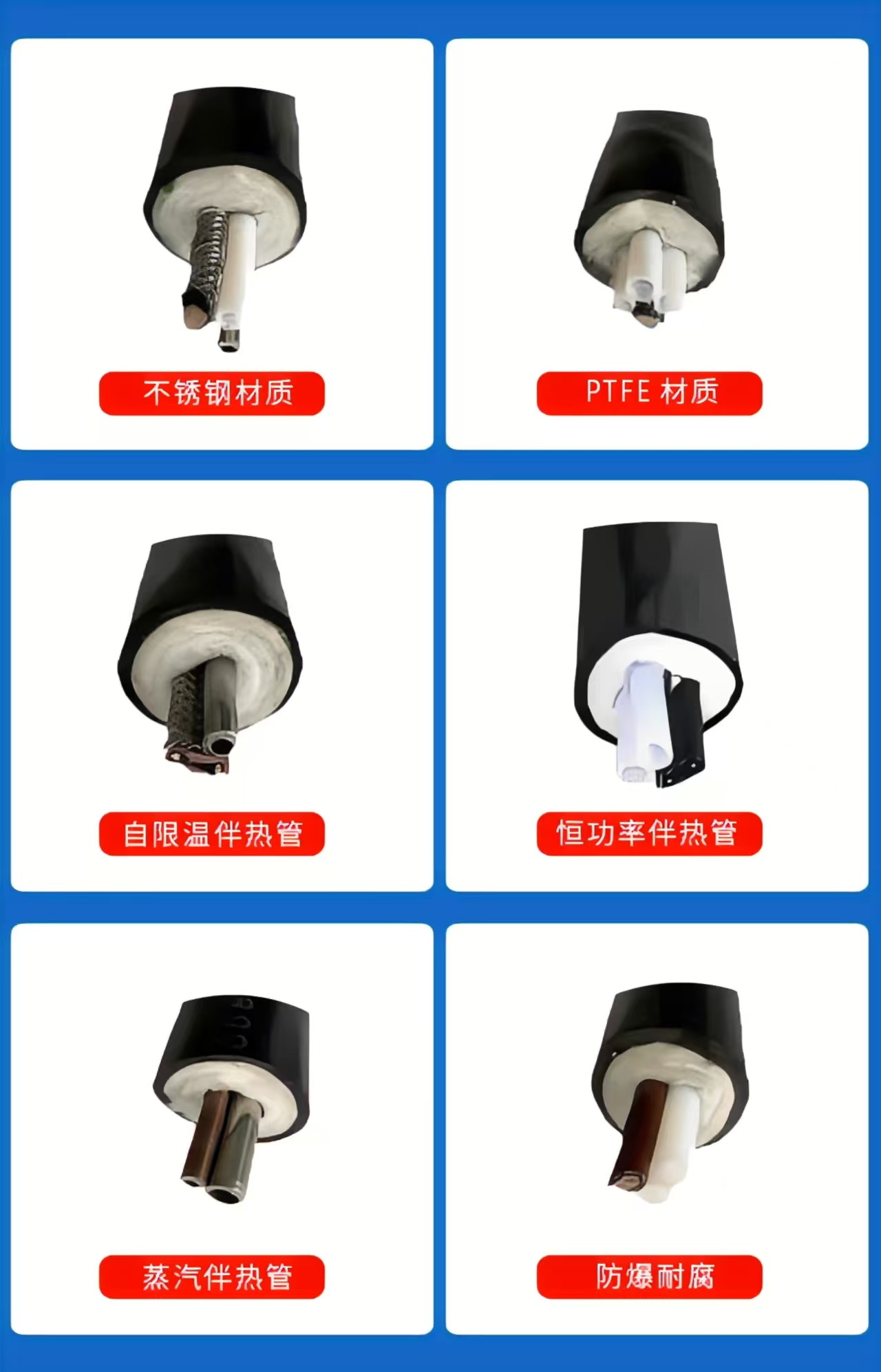 由內(nèi)到外依次為內(nèi)芯、保溫層和保護(hù)外套。內(nèi)芯由一組耐腐蝕高性能樹(shù)脂導(dǎo)管、電伴熱帶以及補(bǔ)償線纜等組成。保溫層用于減少熱量散失,保護(hù)外套一般采用阻燃聚乙烯(PE)材料,起到保護(hù)和阻燃的作用。